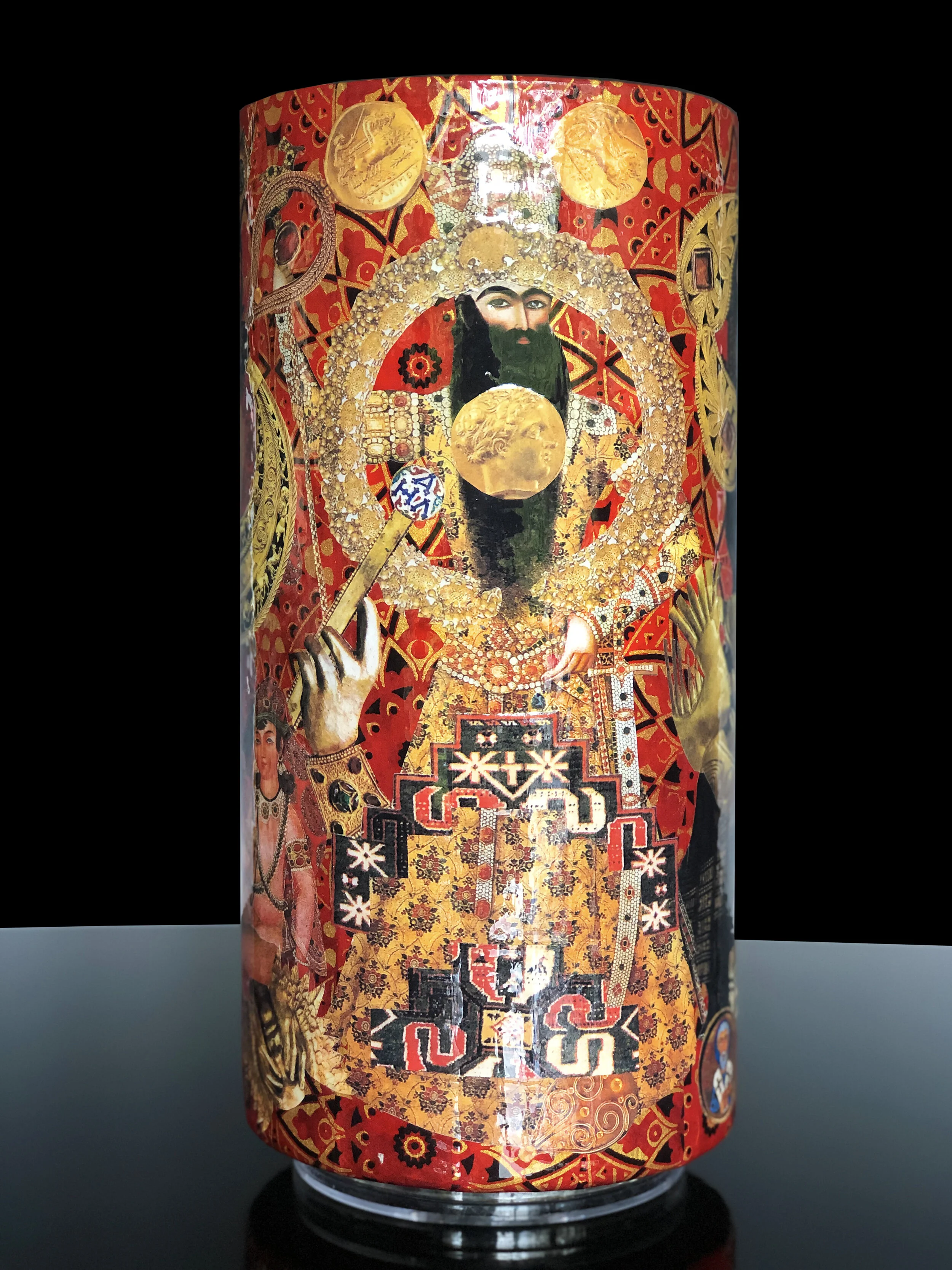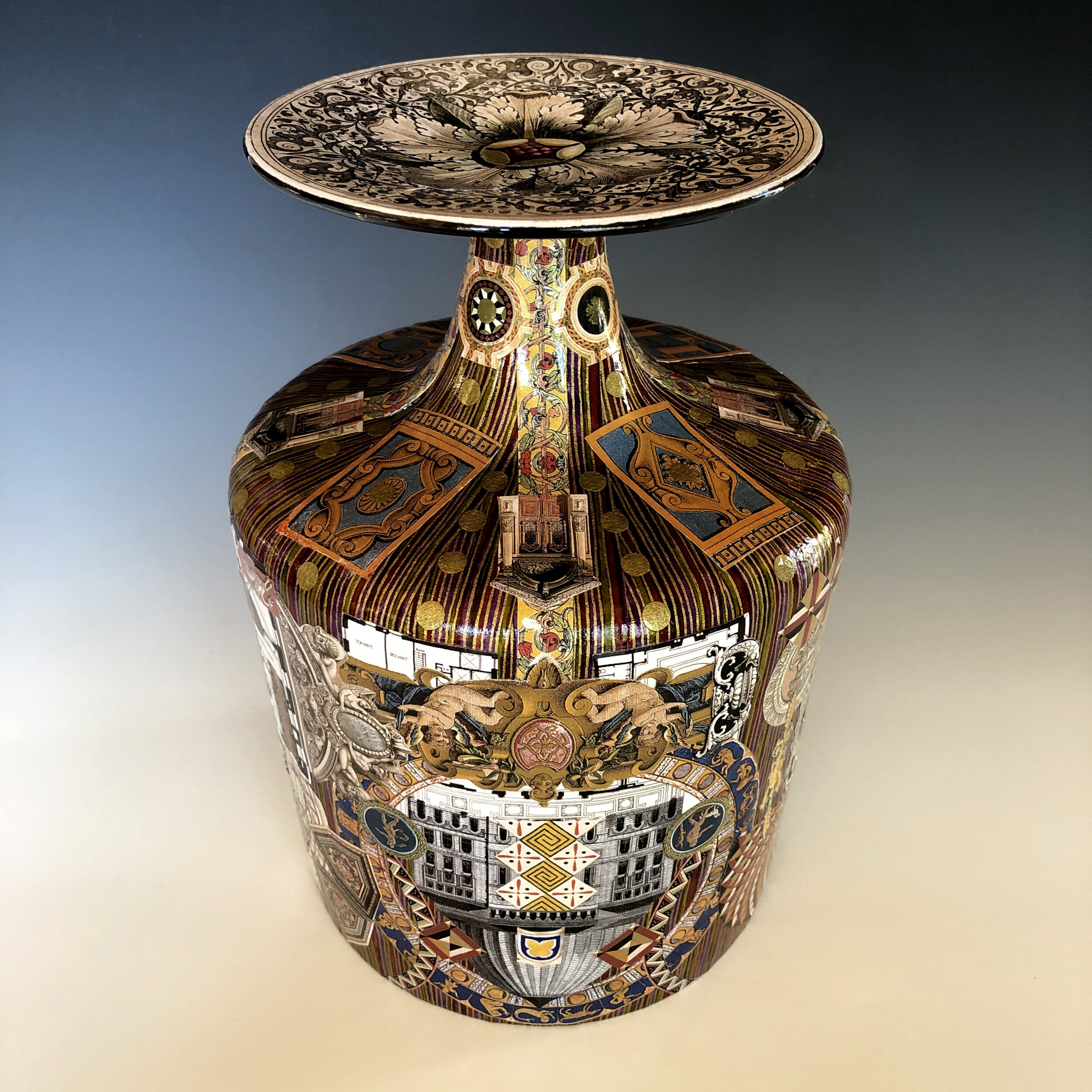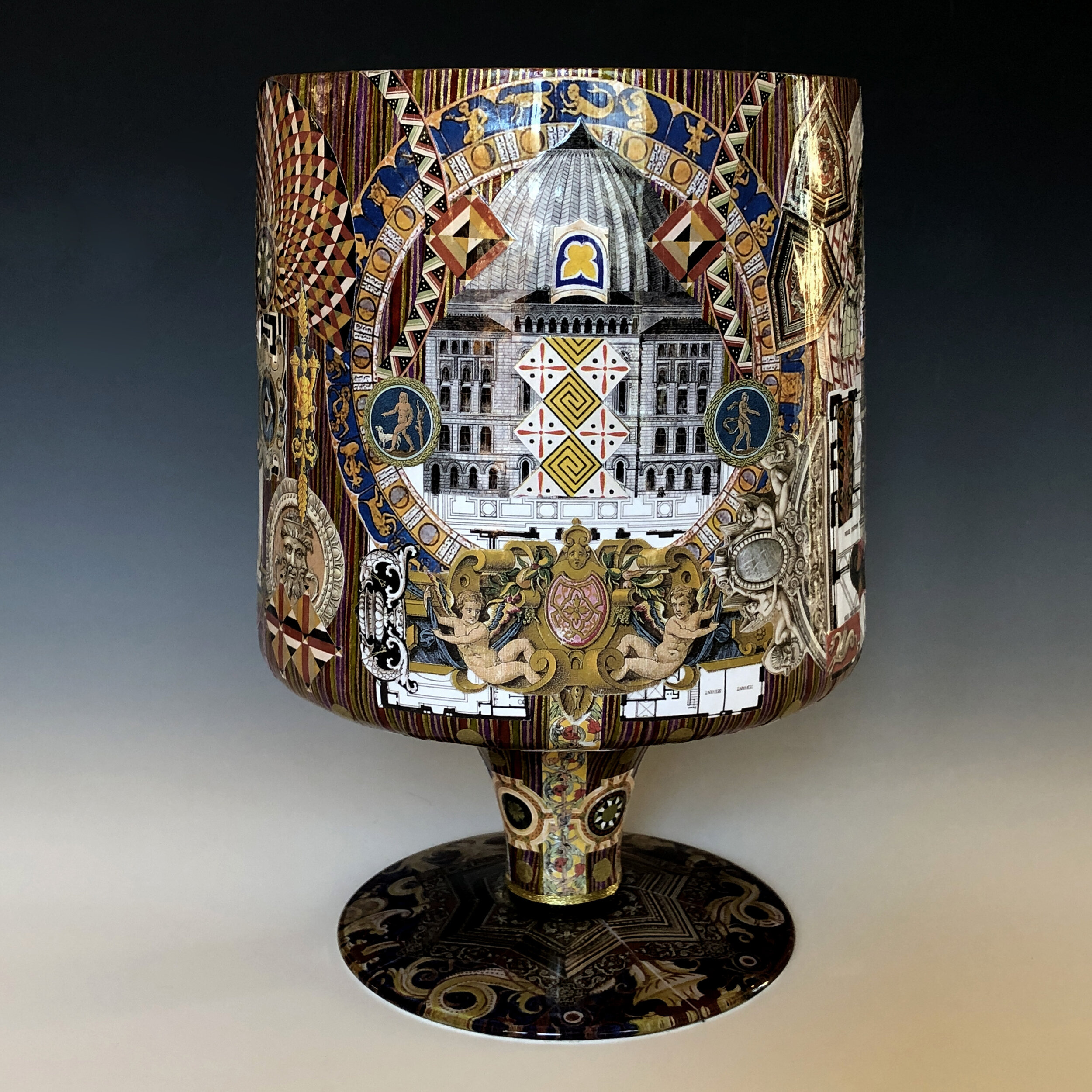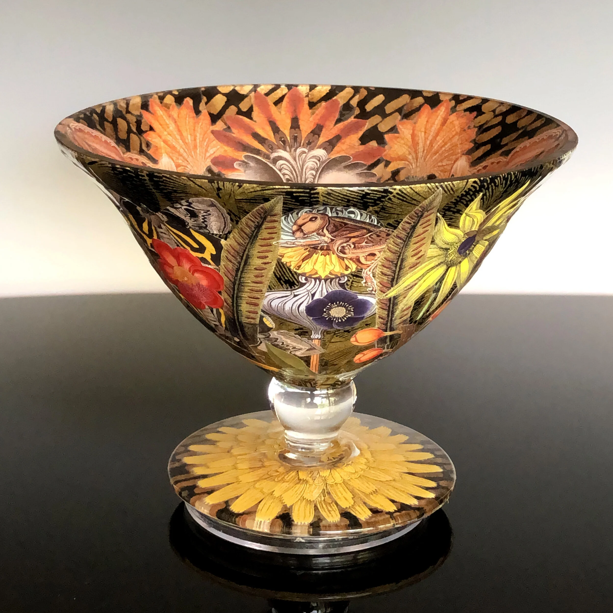 Melinda tells detailed stories through collages on glass, incorporating themes from architecture, natural history, Classical design, Beaux Arts aesthetics, and Baroque details. She relishes using the tiniest line or color delineation in an image to re-examine traditions and compose a new vision. Every piece she creates is a unique puzzle of intricate details reassembled from historical and botanical imagery to tell a new visual story.